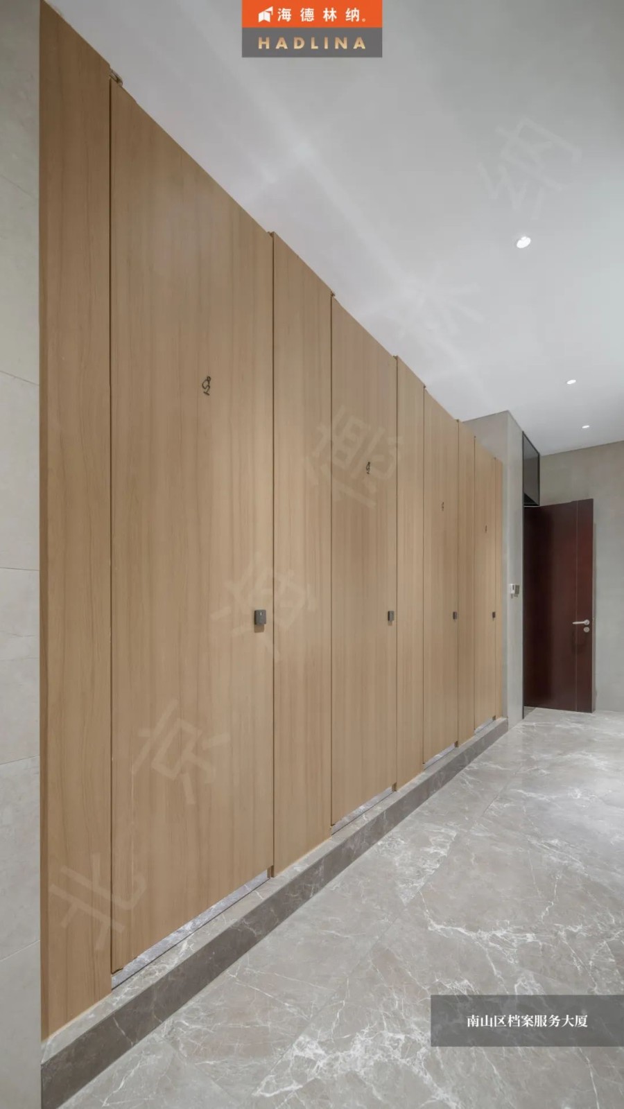 深圳檔案大廈衛生間隔斷采用原木色花紋,展現自然的魅力,恰到好處地融入空間,為整體增色不少。細膩的木紋質感,為使用者帶來溫暖與放松。在這溫暖的氛圍中,人們仿佛置身于自然之中,感受大自然的饋贈。